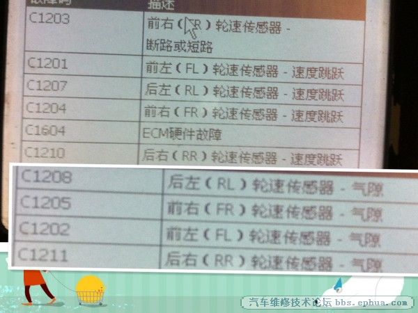 清除故障碼,故障燈熄滅。讀取數(shù)據(jù)流,靜態(tài)輪速=0KM/H,正常。 直線行駛車輛讀取動(dòng)態(tài)輪速,F(xiàn)R輪,RL輪,RR輪基本一致,數(shù)據(jù)項(xiàng)中沒(méi)有FL輪。燈不點(diǎn)亮。 回到廠里,ABS燈再次點(diǎn)亮,讀取故障碼為上圖的C1208,C1205,C1202,C1211。同樣能清除。 檢查前面兩個(gè)輪速傳感器信號(hào)齒圈間隙正常。后面兩個(gè)傳感器為整體式的,不便拆解。 因?yàn)锳BS燈點(diǎn)亮的同時(shí)發(fā)動(dòng)機(jī)燈也偶爾點(diǎn)亮,再結(jié)合ABS模塊數(shù)據(jù)流中沒(méi)有左前輪數(shù)據(jù)選項(xiàng),故分析,是發(fā)動(dòng)機(jī)電腦占用了左前輪速傳感器的信號(hào)作為某項(xiàng)功能的控制策略。 進(jìn)入發(fā)動(dòng)機(jī)電腦讀取故障碼為:車速傳感器信號(hào)范圍/性能 分析:發(fā)動(dòng)機(jī)燈亮是ABS引起的,我們修好ABS系統(tǒng),發(fā)動(dòng)機(jī)燈自然不會(huì)再次點(diǎn)亮。 既然數(shù)據(jù)流暫時(shí)沒(méi)有問(wèn)題,各項(xiàng)指標(biāo)接近正常。那么真的會(huì)是ABS總成壞了嗎?(上圖的故障碼:C1604,ECM硬件故障),我也有點(diǎn)相信是,但我的內(nèi)心告訴我,不應(yīng)該那么容易壞的。 所以我又重新理順了思路: 什么都沒(méi)有問(wèn)題,那么會(huì)不會(huì)是有某兩個(gè)傳感器失效,導(dǎo)致其它傳感器與之對(duì)比出現(xiàn)誤差,而電腦又不知道是不知道是A傳感器,B傳感器,C傳感器,還是D傳感器故障,所以全部報(bào)ABCD傳感器故障呢?既然ABCD有故障,那么發(fā)動(dòng)機(jī)必然也會(huì)儲(chǔ)存相應(yīng)的代碼。 再一次觀察動(dòng)態(tài)數(shù)據(jù),最終發(fā)現(xiàn)右后輪(RR)速傳感器數(shù)據(jù)在4-255KM/H跳越。只有一個(gè)傳感器失效,并不會(huì)構(gòu)成ABCD故障碼,因?yàn)樗鼈冞沒(méi)有相互失去參照,所以,應(yīng)該還有至少一個(gè)傳感器信號(hào)失準(zhǔn)。原因如圖