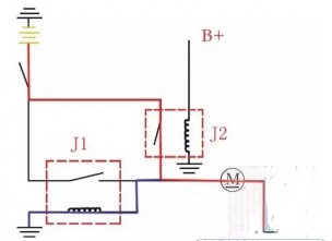 這時,因為一開始J2工作,有電給J1控制線圈供電,J1導(dǎo)通。這時哪怕J2的供電失去,油泵也不會不工作。油泵的供電,會從蓄電池正級,經(jīng)紅色線部分,給油泵供電。
