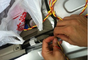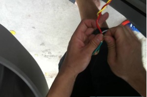 2,沿著這堆線打開一個缺口,找到綠線與黑白線剪開,用汽車電線(注:本人沒買到,因為要買一大圈的.汽配店不散賣,故買了相對較粗的銅電線,沒辦法,電壓是12V,電流較大,所以盡量買大點的穩(wěn)妥點)連接好綠線與黑白線,并用膠布纏好.